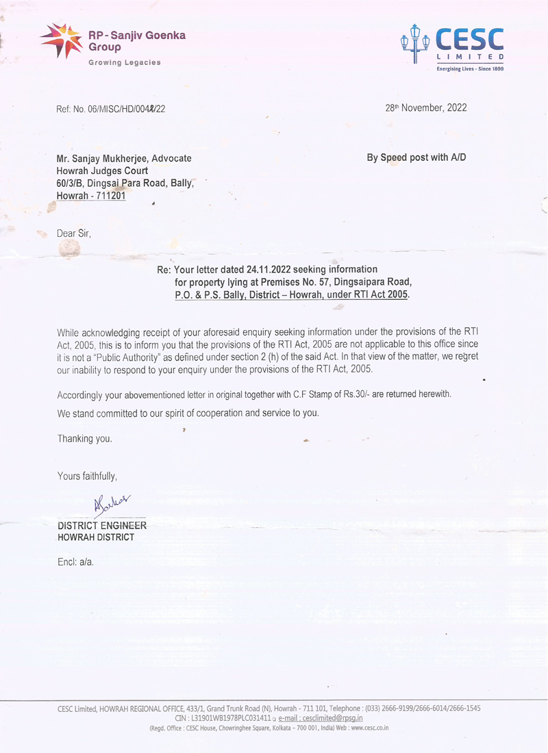 The above is the standard template reply (refusal) for RTI requests to CESC, Howrah - despite acting like a governmental organization, and dealing with services of basic requirement and life support that the Govt. is liable to serve. To open/download PDF file, click below.