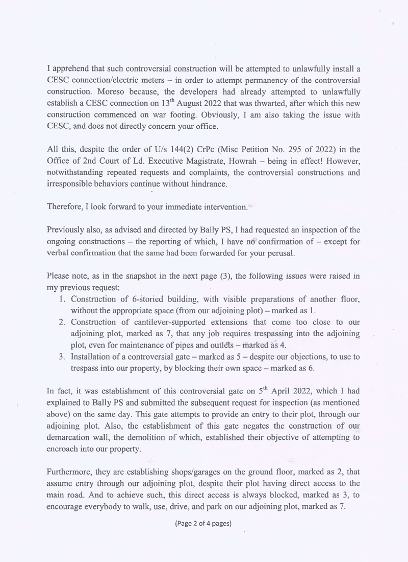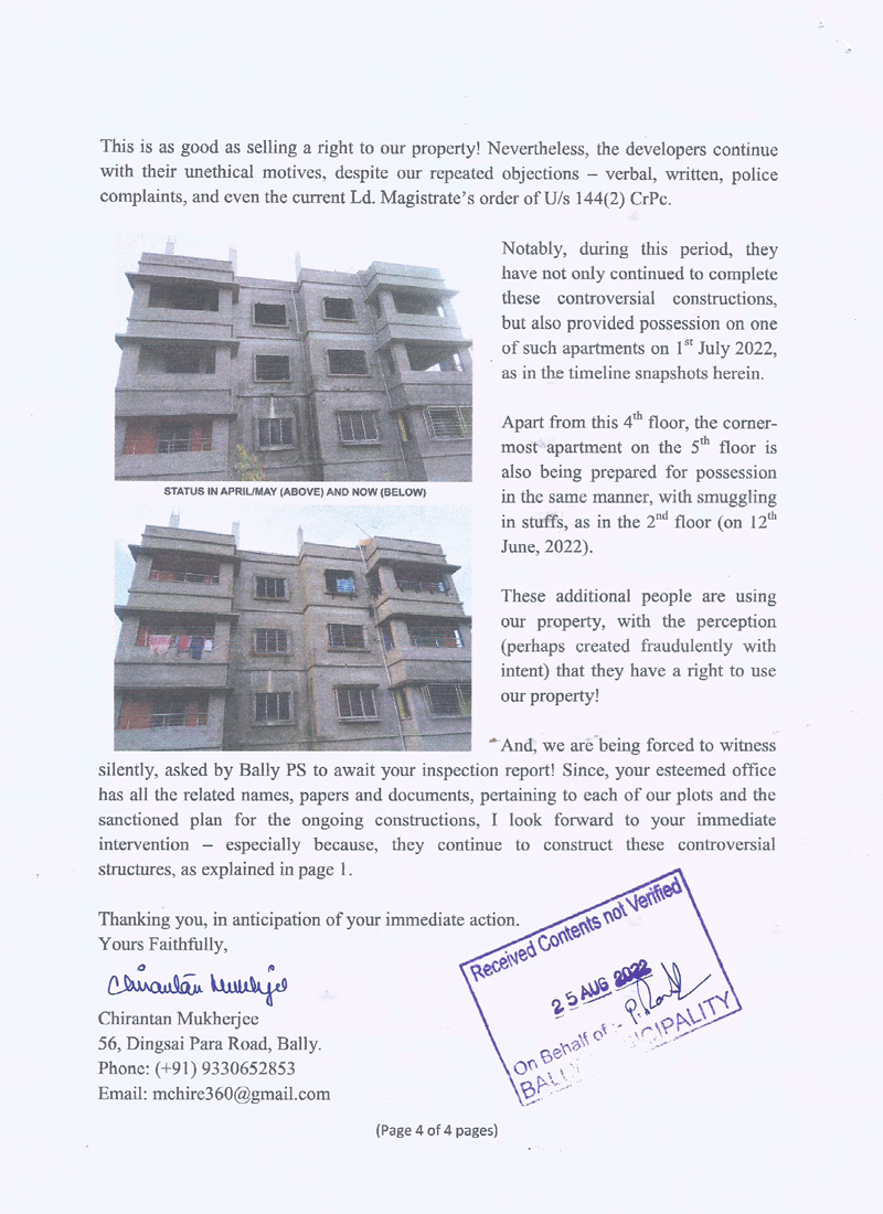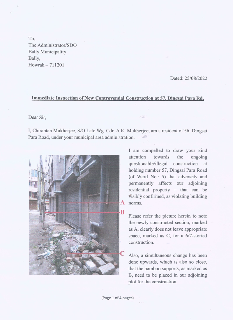 The above is the request for immediate inspection at Bally Municipality, Howrah - after unlawfully constructed structures were made. To open/download PDF file, click below.