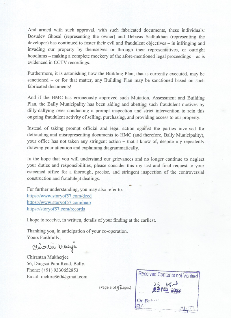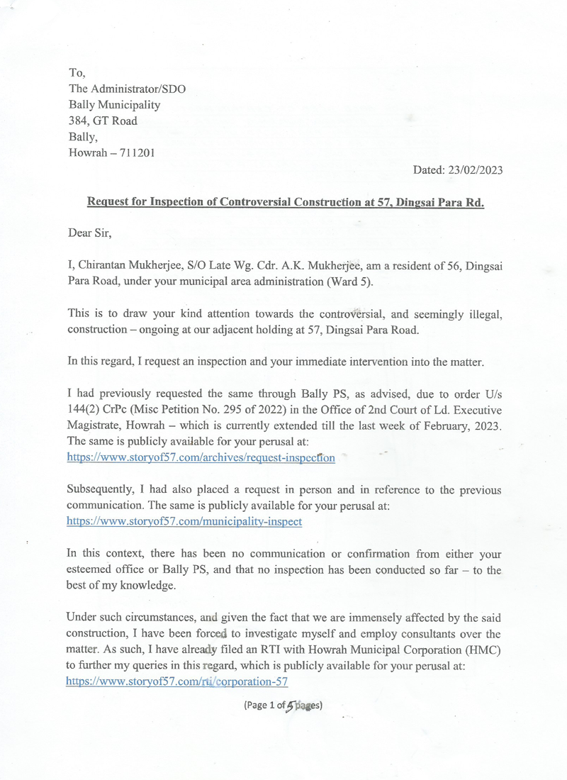The above is to re-iterate the request for immediate inspection at Bally Municipality, Howrah - after almost 10 months of no action. To open/download PDF file, click below.