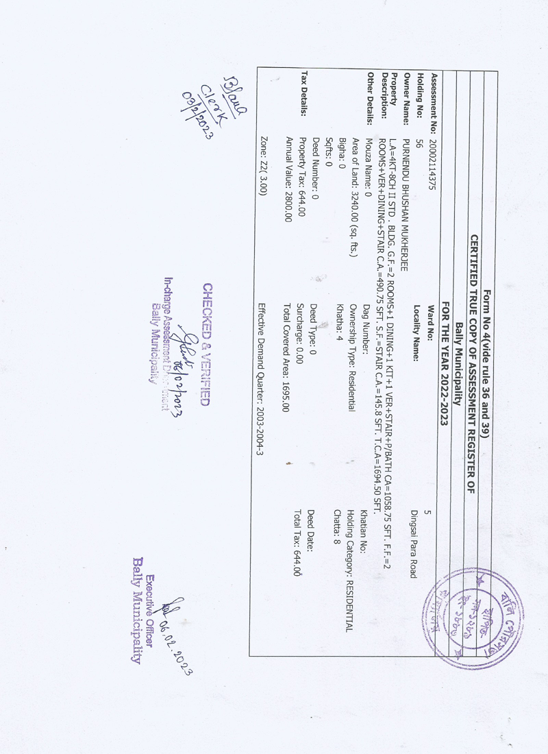 The above are the Porcha/Khosra and Assessment Register from Bally Municipality (wrt 56, Dingsai Para Road). To open/download PDF file, click below.