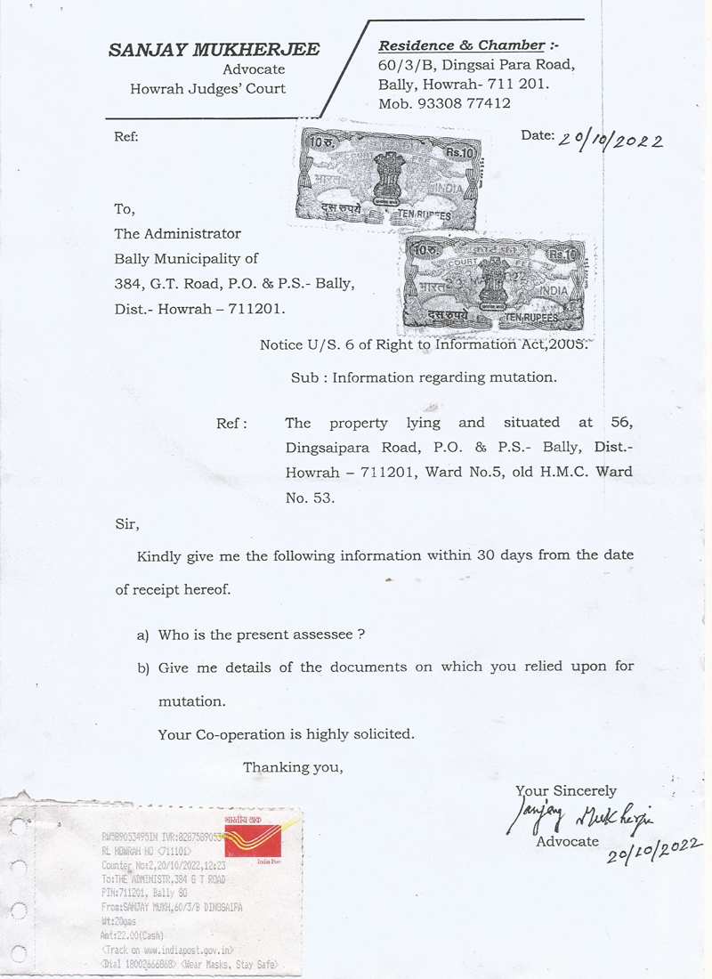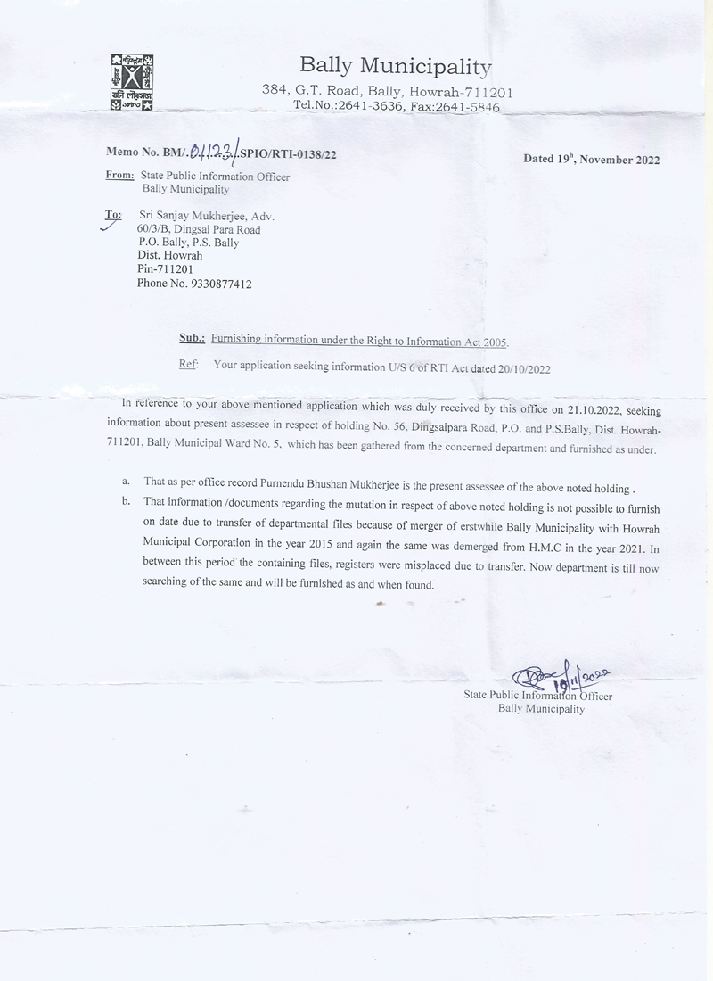 The above is a request for information (wrt holding 56) to Bally Municipality, in accordance to Right to Information Act, 2005. It also includes the response thereof. To open/download PDF file, click below.